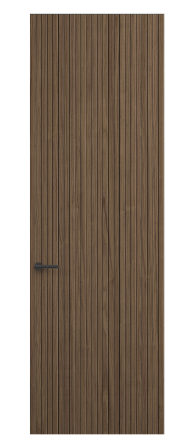 SELECT — коллекция минималистичных дверей с фрезеровкой по натуральному шпону. Рельеф на поверхности полотна создаёт игру света и тени, добавляя пространству динамичности и визуального объёма. Двери SELECT в сочетании со стеновыми панелями и мебельными фасадами, повторяющими лаконичный дизайн, создают единое стилевое решение.