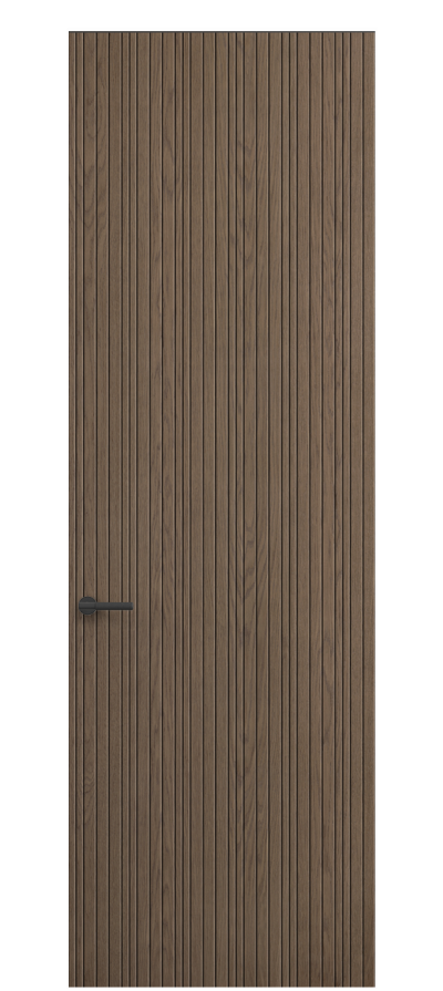 SELECT — коллекция минималистичных дверей с фрезеровкой по натуральному шпону. Рельеф на поверхности полотна создаёт игру света и тени, добавляя пространству динамичности и визуального объёма. Двери SELECT в сочетании со стеновыми панелями и мебельными фасадами, повторяющими лаконичный дизайн, создают единое стилевое решение.